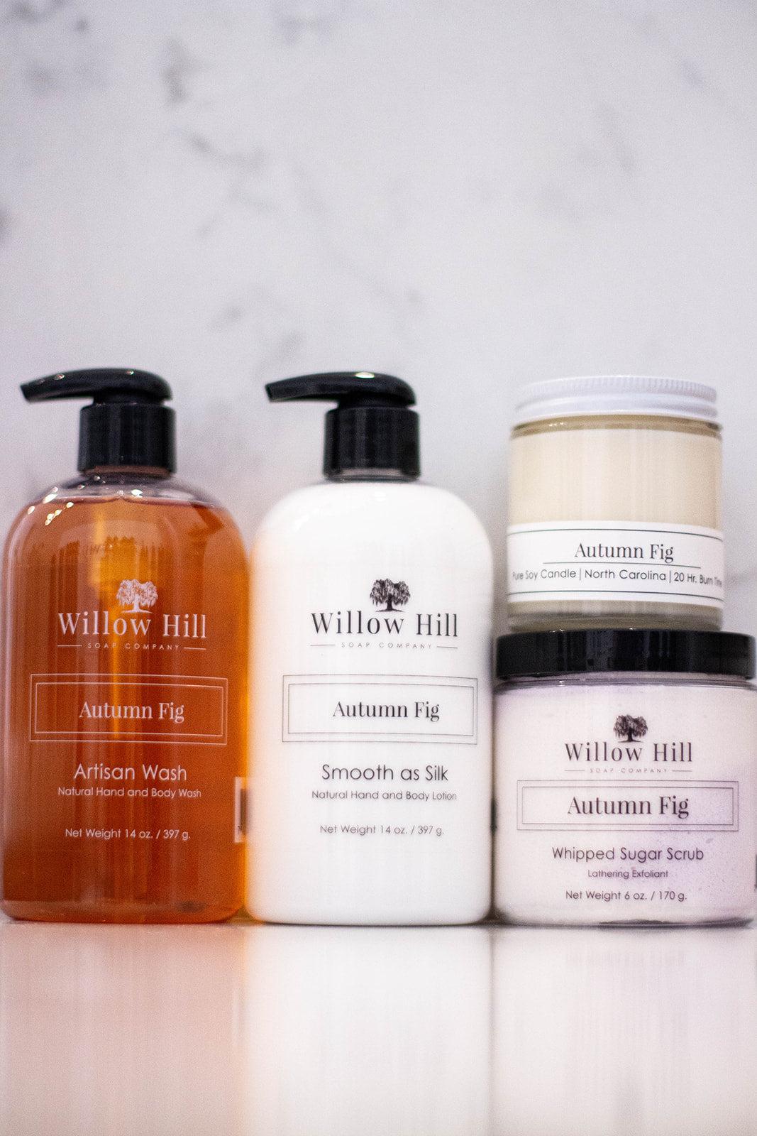 Willow Hill Soap Company Autumn Fig gift set with hand and body wash, lotion, 4 oz candle, and whipped sugar scrub